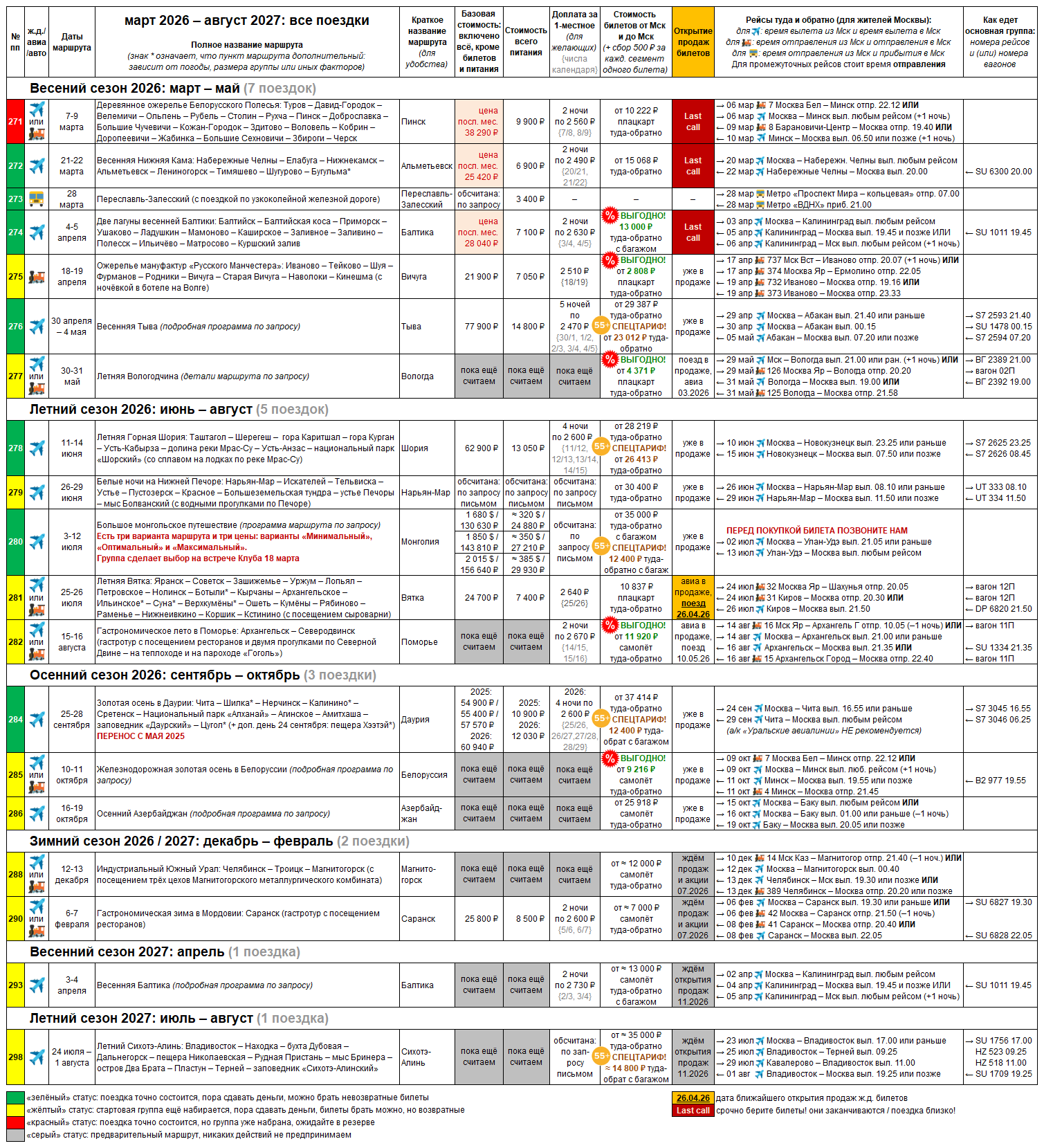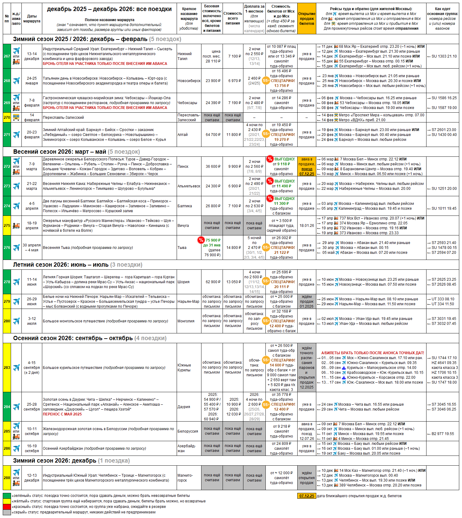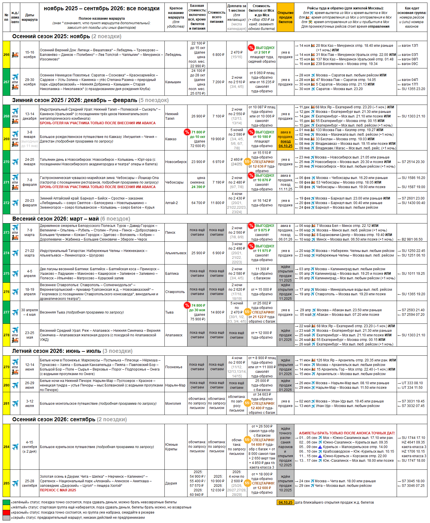 Ныне доступно долгожданное обновление плана поездок и цены до октября 2025 года! Опубликованы стоимости: Винная Волга, Роминта, Южная Осетия, Омск. Набор открыт до начала октября. На поездки с зелёным флагом берите билеты.